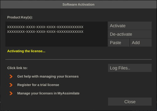 When you click the Activate Key button the software contacts the Assimilate activation server over the internet and sends the keys along with your system's details to validate the keys and generate a license for the system. If the key validates, the license is then automatically installed. A second dialog will pop up asking you to restart the software. On Windows this restart will be done automatically - on OS X the software will just close down and needs to be started manually again.