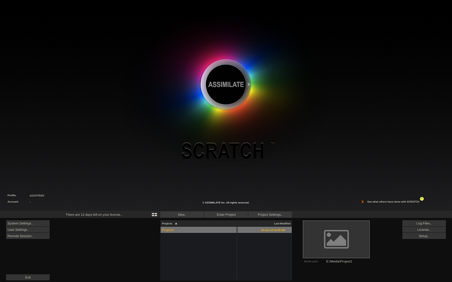 This chapter introduces you to the Start-up Screen in detail, showing you how to create and configure Projects and user profiles and manage Live FX system settings. When Live FX is launched, the Start-up Screen shows the Assimilate logo & product designation in the top part of the screen - the so-called View Port area. The top left corner will contain several links that will open a web page in your default web browser with information on the selected topic.