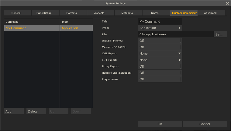 Define a System Event command to run an external script or application after an event in the application: Start Application, Stop Application, Select User, Create-, Open- and Close-Project.