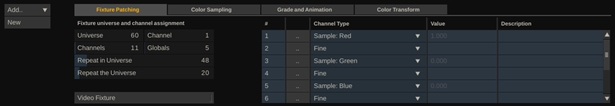 In the Fixture Patching tab of the Fixture menu, you patch a fixture to a specific universe and channel address and specify the channel layout of the fixture in case of a DMX fixture. None of this applies to video fixtures. When you enable the Video Fixture option, all other options are greyed out.